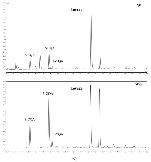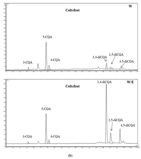 Investigation of phenolic compound contents in coltsfoot was carried out by Dobravalskytė et al. [37]. They conducted analyses of coltsfoot extracts and detected higher caffeoylquinic acid using the HPLC-UV method. Research conducted by this author confirmed the occurrence of phenolic acid in coltsfoot extracts, as well as other phenolic acids such as dicaffeoylquinic and quinic acid. Ivanov [38] found phenolic (e.g., chlorogenic acid and chicoric acid) in dandelion extracts; depending on the extraction method, the content of that compound ranged from 18 mg·100 g−1 d.m. to 37 mg·100 g−1 d.m and from 484 mg·100 g−1 d.m. to 3148 mg·100 g−1 d.m., respectively. It is noteworthy that better extraction results were obtained by using a 50% water-ethanolic mixture as the extractant than 95% ethanol, while part of the investigated compounds were not detected in water extracts. Tsai et al. [39] stated that 50% ethanol is most favourable for extracting individual caffeic acid derivatives from plant Echinacea purpurea. Mirjalili et al. [40] analysed extracts from the dried leaves of lovage, and confirmed that caffeoyoloquinic acids are the main phenolic acids in those extracts. The authors stated that the content of these compounds in dried lovage leaves was 2–60-fold lower in comparison to caffeoylquinic acids.