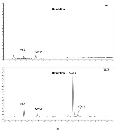 Extracts from dandelion contained compounds such as CTA (caftaric acid), CCA-1 (chicoric acid isomer 1) and CCA-2 (chicoric acid isomer 2), which were not detected in other plant extracts examined in this work. It was stated that the highest content of CCA-1 (chicoric acid isomer 1) was found in water-ethanol of dandelion (73.83 mg CQA·g−1). The water-ethanolic extract of this plant also contained CTA (11.97 mg CQA·g−1) and CCA-2 (4.73 mg CQA·g−1), while in the water extract, there was a small amount of CTA (0.39 mg CQA·g−1). Generally, it was stated that among the water extracts, the highest content of the total studied compounds was characterised by coltsfoot.