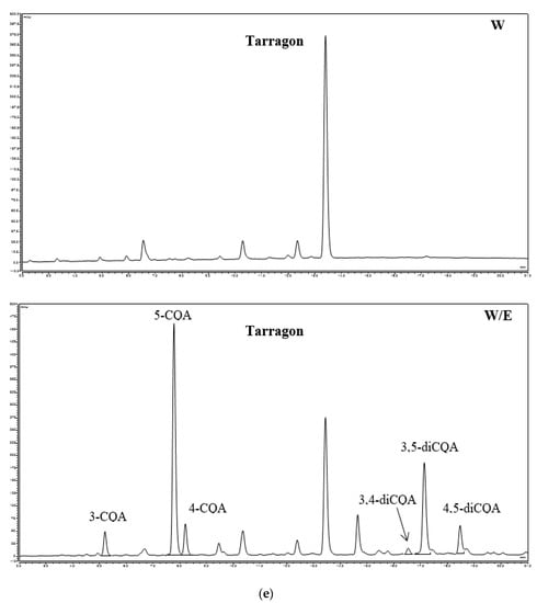 (a) HPLC-PDA chromatograms (320 nm) of phenolic acids of caraway water extracts (W) and water-ethanolic extracts (W/E); 3-CQA—(3-O-caffeoylquinic acid; neochlorogenic acid); 5-CQA—(5-O-caffeoylquinic acid; chlorogenic acid); 4-CQA—(4-O-caffeoylquinic acid; cryptochlorogenic acid); 3,4-diCQA—(3,4-dicaffeoylquinic acid); 3,5-diCQA—(3,5-dicaffeoylquinic acid); 4,5-diCQA—(4,5-dicaffeoylquinic acid). (b) HPLC-PDA chromatograms (320 nm) of phenolic acids of coltsfoot water extracts (W) and water-ethanolic extracts (W/E); 3-CQA—(3-O-caffeoylquinic acid; neochlorogenic acid); 5-CQA – (5-O-caffeoylquinic acid; chlorogenic acid); 4-CQA—(4-O-caffeoylquinic acid; cryptochlorogenic acid); 3,4-diCQA—(3,4-dicaffeoylquinic acid); 3,5-diCQA—(3,5-dicaffeoylquinic acid); 4,5-diCQA—(4,5-dicaffeoylquinic acid). (c) HPLC-PDA chromatograms (320 nm) of phenolic acids of dandelion water extracts (W) and water-ethanolic extracts (W/E); CTA—(caftaric acid); 5-CQA—(5-O-caffeoylquinic acid; chlorogenic acid); CCA-1—(chicoric acid isomer 1); CCA-2—(chicoric acid isomer 2). (d) HPLC-PDA chromatograms (320 nm) of phenolic acids of lovage water extracts (W) and water-ethanolic extracts (W/E); 3-CQA—(3-O-caffeoylquinic acid; neochlorogenic acid); 5-CQA—(5-O-caffeoylquinic acid; chlorogenic acid); 4-CQA—(4-O-caffeoylquinic acid; cryptochlorogenic acid). (e) HPLC-PDA chromatograms (320 nm) of phenolic acids of tarragon water extracts (W) and water-ethanolic extracts (W/E); 3-CQA—(3-O-caffeoylquinic acid; neochlorogenic acid); 5-CQA—(5-O-caffeoylquinic acid; chlorogenic acid); 4-CQA—(4-O-caffeoylquinic acid; cryptochlorogenic acid); 3,4-diCQA—(3,4-dicaffeoylquinic acid); 3,5-diCQA—(3,5-dicaffeoylquinic acid); 4,5-diCQA—(4,5-dicaffeoylquinic acid). (f) HPLC-PDA chromatograms (320 nm) of phenolic acids of white mulberry water extracts (W) and water-ethanolic extracts (W/E); 3-CQA—(3-O-caffeoylquinic acid; neochlorogenic acid); 5-CQA—(5-O-caffeoylquinic acid; chlorogenic acid); 4-CQA—(4-O-caffeoylquinic acid; cryptochlorogenic acid).