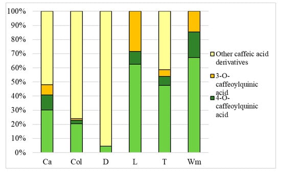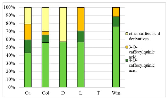 Percentage concentration of caffeic acid derivatives in water extracts. Ca—caraway; Col—Coltsfoot; D—dandelion; L—lovage; T—tarragon; Wm—white mulberry; 5-CQA—(5-O-caffeoylquinic acid; chlorogenic acid); 4-CQA—(4-O-caffeoylquinic acid; cryptochlorogenic acid); 3-CQA—(3-O-caffeoylquinic acid; neochlorogenic acid).