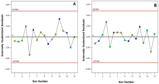 Externally studentized residual plot versus run for (A) particle size and (B) entrapment efficiency% of PIC-E.