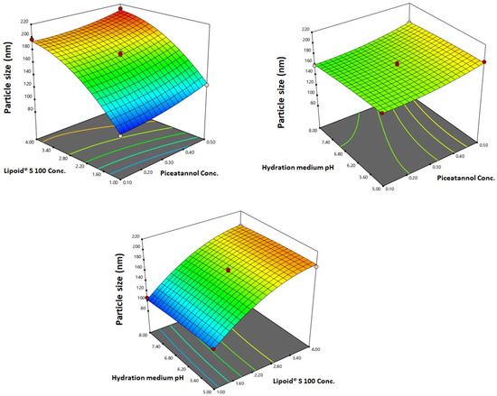 3D response surface plots for the effect of PIC concentration, Lipoid® S 100 concentration, and the pH of the hydration medium on the particle size of PIC-E.