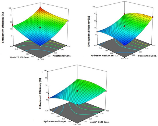 3D response surface plots for the effect of PIC concentration, Lipoid® S 100 concentration, and pH of hydration medium on entrapment efficiency % of PIC-E.