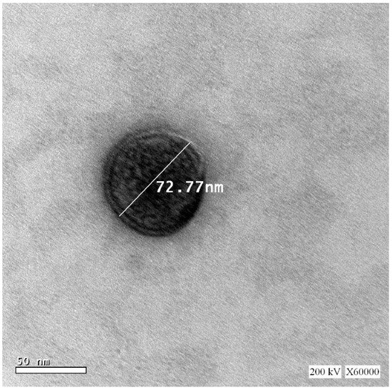 The TEM image of PIC-E is represented in Figure 4. The size of emulsomes was consistent with that obtained from the DLS technique. The emulsomes appeared almost spherical with no aggregation. The ridges that appeared on the emulsomes might be due to the shrinkage of the lipid surface layer during the drying process in the sample preparation. The observed results were similar to those reported emulsomes [21,22].