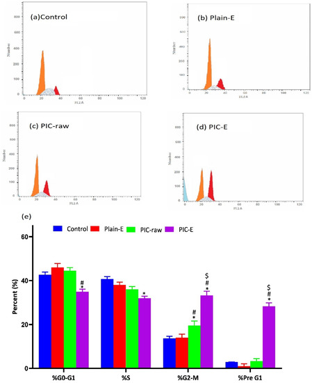 Impact of PIC-E on cell cycle phases of HCT 116 cells. (a) Control, (b) Plain-E, (c) PIC-raw, (d) PIC-E, and (e) bar diagram of the different cycle phases. Cells were incubated for 24 h with plain-E, PIC-raw (0.1 µM) or PIC-loaded E (equivalent to 0.1 µM PIC). * Significantly different from control at p < 0.05. # Significantly different from plain-E at p < 0.05. $ Significantly different from PIC-raw at p < 0.05.