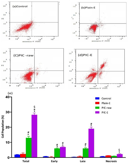 The dual staining technique was performed to assess apoptosis as previously published [17]. The HCT 116 cells were incubated with plain-E, PIC-raw, and PIC -E with reference to 0.1 µM PIC in a six-well plate with a cell density of 5 × 103 cells/well. A control sample with untreated cells was also included in the study. Staining was carried out using a commercially available kit (BD Bioscience, CA, USA). After incubation for 24 h, the cells were collected by centrifugation. The cells were then re-suspended in 500 μL of 1× binding buffer. Then, 5 μL each of annexin V-FITC and propidium iodide (PI) (BD Bioscience) were added and incubated at room temperature for 5 min in the dark. Flow cytometry (FACS Calibur, BD Bioscience) was employed for the analysis. MultiCycle software (Phoenix Flow Systems, San Diego, CA, USA) was used to study the results.