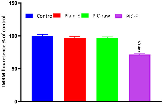Accession of TMRM into mitochondria is an indicator of MMP. Thus, retaining high fluorescence is an indicator of healthy mitochondria. Cells undergoing apoptosis have relatively depolarized mitochondrial membranes. Therefore, decreased fluorescent staining of TMRM is an indirect indicator of mitochondrial membrane disturbing; our data indicate that PIC-raw did not have any significant effect on MMP as compared to the control values. Only PIC-E significantly reduced MMP (Figure 8).