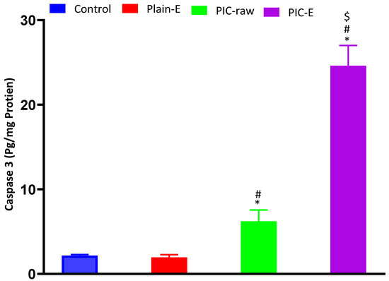 Effect of PIC-E on cleaved caspase-3 content in HCT 116 cells. Cells were incubated for 24 h with plain-E, PIC-raw (0.1 µM), or PIC- E (equivalent to 0.1 µM PIC) * Significantly different from control at p < 0.05. # Significantly different from plain-E at p < 0.05. $ Significantly different from PIC-raw at p < 0.05.