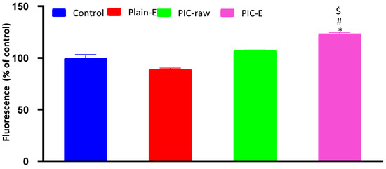 Conversion of DA to fluorescent DCF was used for the determination of ROS in the current study. Only the optimized PIC-E significantly increased ROS production when compared to the control, plain-E, and PIC-raw groups (Figure 12).