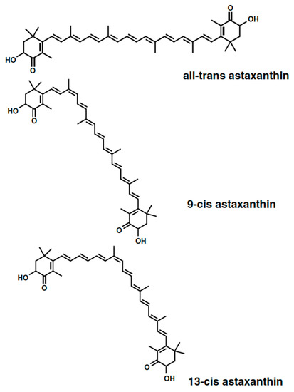 Astaxanthin isomers molecular structures. All-trans-astaxanthin; 9-cis astaxanthin; and 13-cis astaxanthin [10].