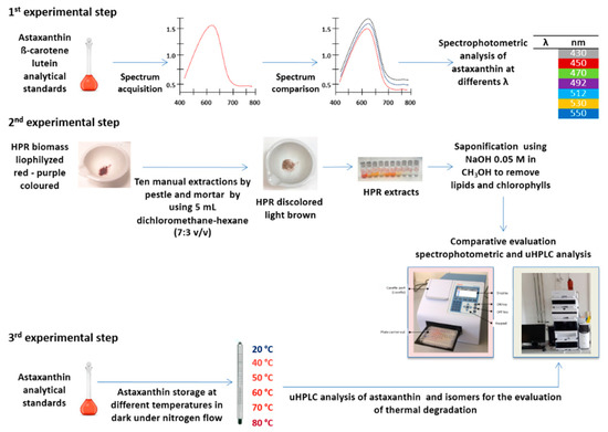Experimentation was planned and divided into three different steps as illustrated in Figure 2. The first step concerned the evaluation of the accuracy of the spectrophotometric analysis of astaxanthin, the second step was a comparative evaluation between spectrophotometric and liquid chromatographic analysis by means of uHPLC for the quantification of carotenoids in the microalgae H. pluvialis, and the third step was related to the evaluation of the effect of temperature on the concentration of astaxanthin and its isomers.