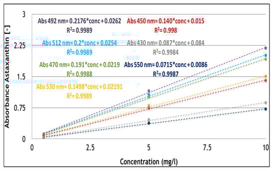 Furthermore, astaxanthin absorbance was also analyzed at wavelengths below 492 nm, such as 430, 450, and 470 nm which were not already evaluated [31]. These wavelengths, that are most appropriate for carotenoids such as β-carotene and lutein were selected to investigate the response of astaxanthin and possible overestimation or underestimation of astaxanthin quantification by spectrophotometer.