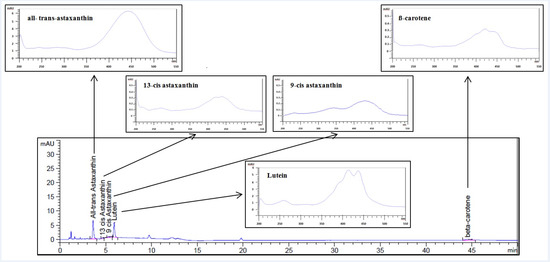 In addition to the amount of astaxanthin, the content of carotenoids was analyzed directly using uHPLC-DAD. The chromatogram and the relative absorption spectra of each of the carotenoids with their characteristic shape are shown in the Figure 5.