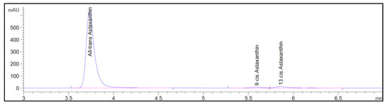 Three isomers were identified in uHPLC-DAD. The all-trans-astaxanthin isomer had an average isomeric ratio of 96.2% ± 0.75%, followed by 9-cis astaxanthin and 13-cis astaxanthin with an average isomeric ratio equal to 1.23% ± 0.15% and to 2.30% ± 0.235, respectively.