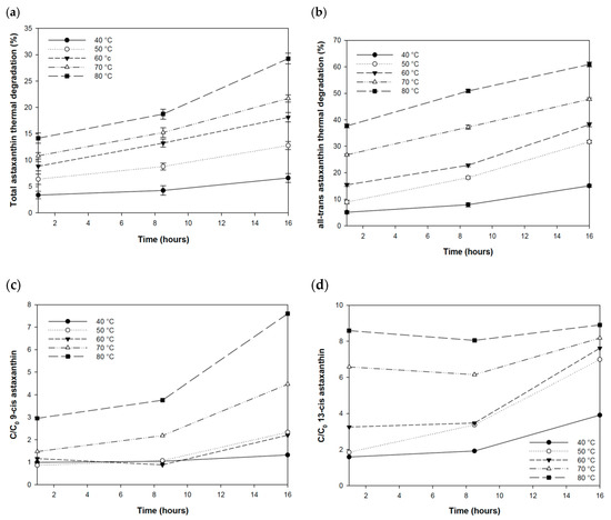 Astaxanthin and isomer concentrations were subsequently quantified on the samples stored in a thermostatically controlled water bath for each tested temperature in the range 40–80 °C. The effect of temperature on astaxanthin was expressed as percentage degradation (Figure 7a). In general, the effect of temperature was predominantly observed at higher temperatures, i.e., above 50 °C. After one hour of storage, the highest percentage of degradation was observed at 70 and 80 °C when astaxanthin concentration decreased 10.8% ± 0.59% and 14.2% ± 0.97%, respectively. A significant decrease was also observed at the other tested temperatures (p < 0.001), as highlighted by the analysis of variance (one-way ANOVA) performing Dunnett’s test. For all temperatures, the thermal degradation increased over time, reaching the maximum effect at 80 °C after 16 h with a decrease of 29.3% ± 1.02%, whereas the minimum effect was reached at 40 °C equal to 6.6% ± 0.86%.