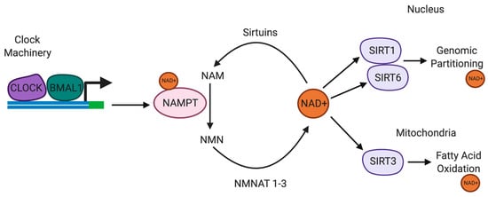 Circadian rhythms are regulated by the availability of NAD+. NAMPT is a SIRT1/CLOCK/BMAL1-regulated circadian gene. SIRT1 and NAMPT and NMNAT form part of a circadian regulatory feedback loop, regulating the availability of NAD+. NAD+ regulates SIRT1, SIRT3 and SIRT6 activities. SIRT1 also regulates CLOCK/BMAL1 expression in the suprachiasmatic nucleus. SIRT6 regulates chromatin recruitment of CLOCK/BMAL1. SIRT3 regulates oxidative phosphorylation and fatty acid oxidation in the mitochondria via circadian deacetylation of mitochondrial enzymes. Abbreviations: NAD+, nicotinamide adenine dinucleotide; NAMPT, nicotinamide phosphoribosyltransferase; NMNAT, nicotinamide mononucleotide adenyltransferase; SIRT, sirtuins.