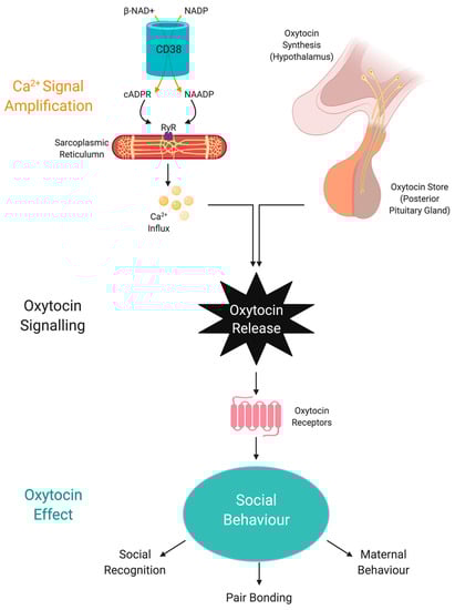 NAD+ regulates oxytocin activity via CD38 and cADPR. Social behaviour is regulated by the amount of central OXT released due to NAD-dependent calcium release by CD38 activity and cADPR generation. Abbreviations: NAD+, nicotinamide adenine dinucleotide; NADP, nicotinamide adenine dinucleotide phosphate; CD38, NAD+ glycohydrolase; cADPR, cyclic adenosine diphosphoribose; OXT, oxytocin; NAADP, nicotinic acid adenine dinucleotide phosphate; Ryr, ryanodine receptor.