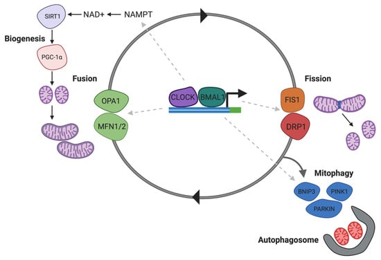NAD+ regulates Drp1 associated in mitochondrial homeostasis. CLOCK/BMAL1 modulated mitochondrial biogenesis and mitophagy via NAD-dependent SIRT1. Deacetylation of the transcription factor PGC1A by SIRT1 regulates mitochondrial biogenesis. Drp1-mediated mitochondrial fission precedes mitophagy leading to formation of fragmented mitochondria that are taken up by autophagosomes. Abbreviations: NAD+, nicotinamide adenine dinucleotide; NAMPT, nicotinamide phosphoribosyltransferase; SIRT1, sirtuin-1; OPA1, mitochondrial dynamin like GTPase; MFN1/2, mitofusin-1/2; FIS1, mitochondrial fission 1 protein; DRP1, dynamin-related protein-1; PINK1, PTEN-induced kinase 1; BNIP1, BCL-2 interacting protein 1; PARKIN, E3 ubiquitin-protein ligase parkin.