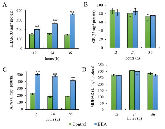 BEA treatment induced a significant increase in only two of the enzymes involved in ASC metabolism, namely DHAR and APX, while no difference was registered for MDHAR and GR (Figure 3). DHAR activity increase was time-dependent and statistically significant at all time points (p < 0.01) (Figure 3, Panel A). Likewise, APX increase was statistically significant at all time points (p < 0.01), with the highest increment being registered after 12 h (Figure 3, Panel C). GR (Figure 3, Panel B) and MDHAR (Figure 3, Panel D) levels remained constant and not statistically significant throughout the assay in both control and BEA treated samples.