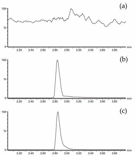 The plasma EGCG concentrations were measured using ultra-performance liquid chromatography-electrospray tandem mass spectrometry (UPLC-ESI-MS/MS). This methodology has been previously validated [23,42]. Figure 2 shows analytical chromatograms of control (plasma at baseline) (Figure 2a), a blank spiked with a known concentration of an analytical standard of EGCG (Figure 2b), and a real sample (Figure 2c). No interfering peaks at the retention time of the EGCG peak were observed.
