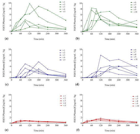 In reference to the limitations of our study, in spite of the sample size being calculated to obtain significant results in three series of experiments (n = 10), a higher number of volunteers would be desirable to reduce the interindividual variability related to EGCG disposition. Moreover, the main cause of interindividual variability is the low EGCG bioavailability estimated in humans (0.1%–0.3%) [63,64]. Small changes in this percentage result in significant changes in plasma concentrations beyond the differences among individuals in the genetic background related to EGCG metabolism. For example, a variation of EGCG bioavailability from 0.3% to 0.6% causes an increase of 100% in the EGCG plasma concentration. For these reasons, the present crossover study tries to reduce the impact of interindividual variation due to each volunteer used as its own control.
