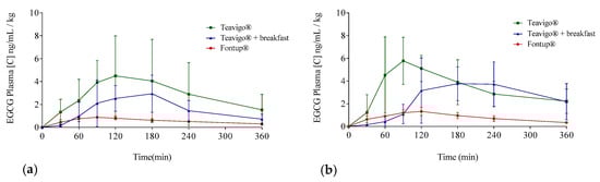 Averages of EGCG plasma concentrations over time distributed following EGCG preparation and gender: Teavigo® condition is shown in green lines, Teavigo® plus breakfast is in blue lines, and FontUp® is in red lines. (a) EGCG average concentrations for men and (b) EGCG average concentrations for women. Error bars represent the standard deviation.