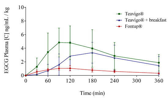 As mentioned before, a standard breakfast composed by milk, cocoa, cereals, and toasts with olive oil reduces the bioavailability of EGCG (Figure 5), in accordance with results obtained in other studies [23,35,39]. For example, some authors have concluded that the combined intake of Teavigo® with semi-skimmed milk generates a significant decrease of EGCG bioavailability [23,35,39]. Moreover, Teavigo® taken with breakfast and, to a lesser extent, FontUp® showed a delay (Tmax) to reach the higher concentration peak (Cmax) of bioavailability in plasma (Table 3 and Figure 3, Figure 4 and Figure 5). The intake of food products delays the rate of gastric emptying, which is critical to determine the absorption rate in the small intestine and influences the bioavailability of orally administered drugs [56]. More likely, the intake of enough amount of nutrients with EGCG activates the gastrointestinal processes and delays the gastric emptying. Consequently, the EGCG molecules spend more time on the basic environment of the small intestine, increasing their degradation. Therefore, the absorption of EGCG with additional nutrients is not only reduced but also delayed as compared to EGCG alone, which is able to pass directly to small intestine to be absorbed.