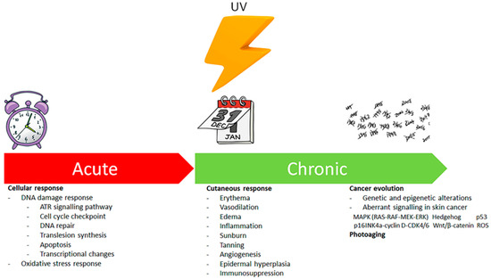 Ultraviolet radiation (UVR) is one of the most pervasive environmental interactions with humans. UV exposure mainly influences the skin in humans and is able to induce the appearance of skin erythema and vasodilation, inflammation, immunosuppression, dermatoheliosis and epidermal hyperplasia [1,2,3,4,5,6,7,8,9] [Table 1]. Moreover, chronic Ultraviolet (UV) irradiation increases the danger of skin carcinogenesis [10] (Figure 1).
