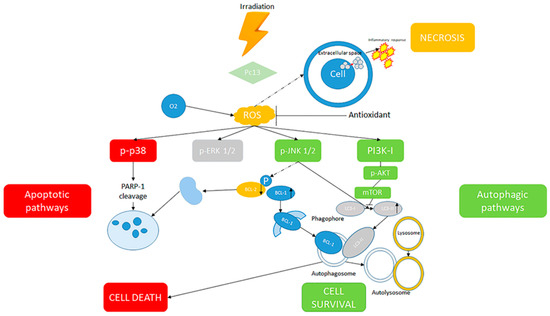 The increase in ROS can also stimulate a third type of cell death, autophagy, an event involving a selective destruction of cellular elements (Figure 3). Under stress situations, autophagy has a pro-survival action implicated in the renewal of proteins and removal of injured organelles to preserve cell health [94]. However, disproportionate autophagy or the incongruous stimulation of autophagy may cause cell death [95]. In any case, the generation of an autophagic response has been revealed after PDT, but a double action has been reported, since it may cause either a survival stimulus or an increased death pathway [96].