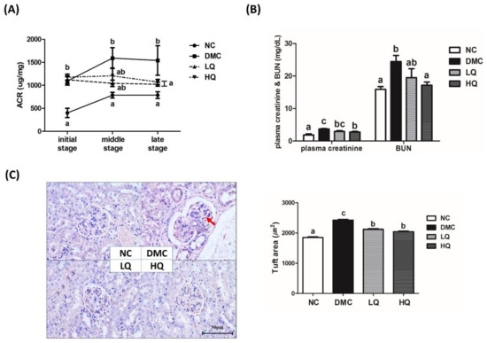 Effect of QAE on (A) urine albumin/creatinine ratio (ACR), (B) level of plasma creatinine and blood urea nitrogen (BUN), and (C) renal morphology and glomerular size in T2DM. Data were expressed as means ± SEM. Mean values with the same superscript letter (a,b and c) are not significantly different (p < 0.05). NC: Normal mice; DMC: Type 2 diabetic mice; LQ: Type 2 diabetic mice supplemented with a low dose (5 mg/kg/day) of QAE; HQ: Type 2 diabetic mice supplemented with a high dose (10 mg/kg/day) of QAE.