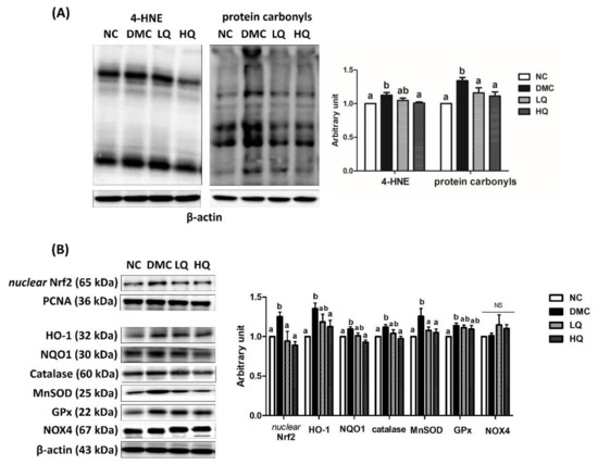 Effect of QAE on renal (A) 4-hydroxynonenal (4-HNE) and protein carbonyls and (B) antioxidant defense system in T2DM mice. Data were expressed as means ± SEM. Mean values with the same superscript letter (a,b) are not significantly different (p < 0.05). NC: Normal mice; DMC: Type 2 diabetic mice; LQ: Type 2 diabetic mice supplemented with a low dose (5 mg/kg/day) of QAE; HQ: Type 2 diabetic mice supplemented with a high dose (10 mg/kg/day) of QAE.