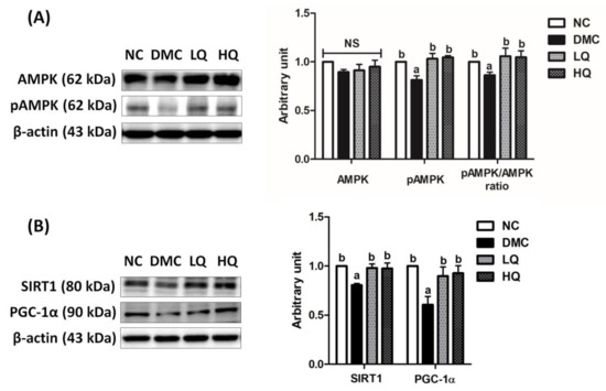 Effect of QAE on renal AMPK/SIRT1 signaling in T2DM mice. (A) Phosphorylation of AMPK and (B) SIRT-1 and PGC-1α. Data were expressed as means ± SEM. Mean values with the same superscript letter (a,b) are not significantly different (p < 0.05). NC: Normal mice; DMC: Type 2 diabetic mice; LQ: Type 2 diabetic mice supplemented with a low dose (5 mg/kg/day) of QAE; HQ: Type 2 diabetic mice supplemented with a high dose (10 mg/kg/day) of QAE.