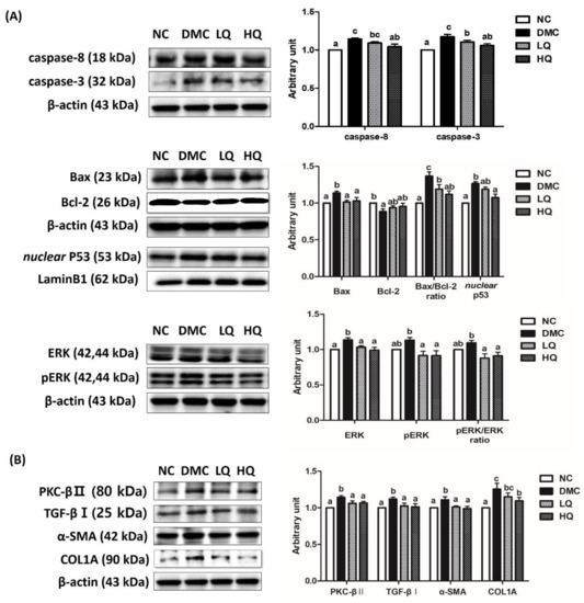 Effect of QAE on renal (A) apoptosis and (B) fibrosis in T2DM mice. Data were expressed as means ± SEM. Mean values with the same superscript letter (a,b and c) are not significantly different (p < 0.05). NC: Normal mice; DMC: Type 2 diabetic mice; LQ: Type 2 diabetic mice supplemented with a low dose (5 mg/kg/day) of QAE; HQ: Type 2 diabetic mice supplemented with a high dose (10 mg/kg/day) of QAE.