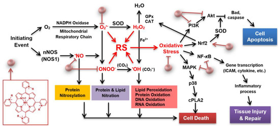 Our focus has been on the study of redox-active metal complexes as therapeutics, which can penetrate cellular and mitochondrial membranes and cross the blood–brain barrier (BBB). We developed cationic complexes of Mn(III) with N-alkyl or N-alkoxyalkyl-substituted pyridylporphyrins; a cyclic porphyrin ligand assures the extreme stability of the metal complex and thus the integrity of the metal site where redox reactions of interest occur [4,5,6,7]. The potency of those compounds approaches that of SOD enzymes. Like SOD enzymes, Mn porphyrins suppress oxidative stress and excessive inflammation via direct reactions with reactive species (e.g., O2•−, •NO, and OONO−), but also indirectly via redox modulation of transcription factors, most so NF-кB, Nrf2 and MAPKs [1,2,6,8,9]. Redox modulation occurs via Mn porphyrin-driven catalysis of oxidation/S-glutathionylation of cysteines of signaling proteins in the presence of H2O2 and glutathione [1,6].