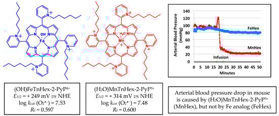 Structures of aqua Mn(III) meso-tetrakis(N-n-hexylpyridinium-2yl)porphyrin, (H2O)MnTnHex-2-PyP5+ and monohydroxo Fe(III) meso-tetrakis(N-n-hexylpyridinium-2yl)porphyrin, (OH)FeTnHex-2-PyP4+. Redox properties that determine the ability of these compounds to exhibit therapeutic effects are listed: metal centered reduction potential for MIII/MII redox couple, E1/2 in mV vs. NHE (M = metal) and log value of the rate constant for the metalloporphyrin-driven catalysis of O2•−dismutation, log kcat(O2•−). Lipophilicities are also listed, expressed in terms of the thin-layer chromatographic Rf, which shows the path of the compound vs. the path of the solvent on silica plates in acetonitrile/KNO3(sat)/water = 8:1:1. Data are taken from [13]. At an identical intraperitoneal (IP) dosing of 10 mg/kg, MnHex does cause a blood pressure drop in mice, while FeHex does not (modified from [13]).