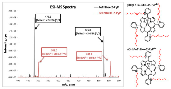 Electrospray-ionization mass spectrometry (ESI-MS) spectra of (OH)FeTnHex-PyP4+ (FeHex) and its internal standard (OH)FeTnBuOE-2-PyP4+. The main m/z ions are identified as [FeP5+ + 2HFBA−]3+ and [FeP5+ + 3HFBA−]2+ for both FeHex and internal standard, (OH)FeTnBuOE-2-PyP4+ (FeBOE), and were further used in the LC-MS/MS analyses of samples. When m/z ions are listed, FeP stands for Fe porphyrin and refers to both FeHex and the internal standard. The structures of (OH)FeTnBuOE-2-PyP4+ and (OH)FeTnHex-PyP4+ are also shown. The axial hydroxo ligands, shown in structures, are lost/defragmented during electrospray ionization/declustering process, resulting in the ion mass indicated.