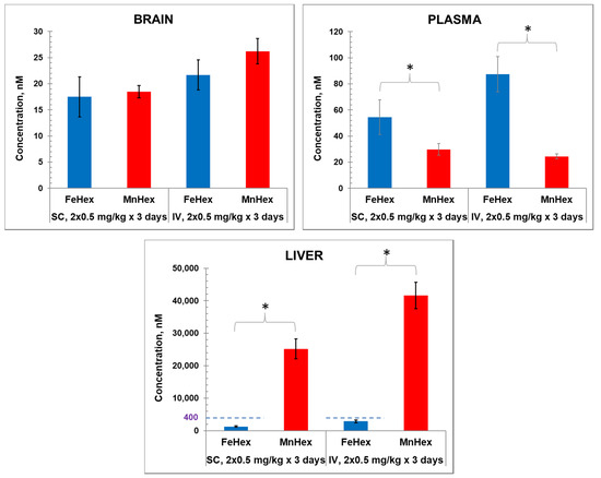 The 3-day mouse PK study. MnHex and FeHex were given twice daily to healthy mice via two administration routes: SC at 0.5 mg/kg and IV at 0.5 mg/kg. Three mice were analyzed per data point and per compound. Mice were sacrificed 6 h after last injection, at which point plasma and tissues were analyzed. Error bars depict single standard deviation. Brain SC, FeHex vs. MnHex, p = 0.728; Brain IV FeHex vs. MnHex, p = 0.275; Plasma SC FeHex vs. MnHex, p = 0.042; Plasma IV, FeHex vs. MnHex, p = 0.019; Liver SC, FeHex (126 nm) vs. MnHex, p = 0.005; Liver IV, FeHex (290 nm) vs. MnHex, p = 0.003. Please note different scale (in blue) for FeHex bars in “Liver” plot. The “star” (*) symbol denotes statistically significant difference (p < 0.05).