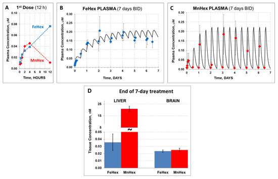 The 7-day rat PK study in healthy rats. FeHex and MnHex were given to rats SC for 7 days every 12 h at 0.225 mg/kg. (A) FeHex single plasma PK within the first 12 h was done at 10 min, 30 min, and 1 h 2 h, 4 h, and 12 h after the 1st injection. (B,C) Plasma levels were followed before and 2 h after each subsequent injection; solid line represents the predicted profile after first-order absorption/first-order elimination simulation by WinNonlin software. (D) Liver and brains were taken for analysis 12 h after the last injection. Error bars depict single standard deviation. Liver, FeHex vs. MnHex, p = 0.004. Brain, FeHex vs. MnHex, p = 0.548.