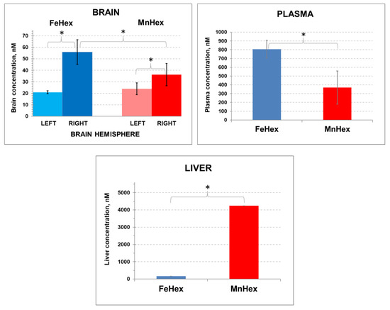 In order to assess the kinetics of the FeHex and MnHex distribution into the injured as well as in the healthy brain, we treated the animals after MCAO injury and measured the levels of the compounds in both the left (not injured) and right (injured by MCAO) brain hemispheres. As obtained in 3-day and 7-day PK studies (Figure 4 and Figure 5), FeHex levels are higher in plasma and lower in the liver than those of MnHex (Figure 6).