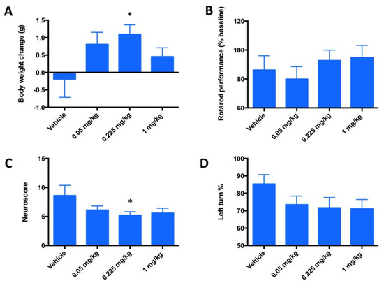 Evaluation of the neurologic deficit in a 3-day mouse MCAO stroke model in terms of motor neuron activities. Mice (n = 20) underwent a 90-min occlusion. FeHex was given IV via the tail vein at three different doses starting at 90 min post ischemia/reperfusion and continued twice daily for 3 days. (A) Body weights are expressed as body weight at 3 days post-stroke - body weight at surgery day; (B) rotarod performance, data are presented in % and are calculated as [(reading after injury)/(reading before surgery-baseline reading)] × 100; (C) neuroscore; and (D) Corner test. Vehicle vs. 0.225 mg/kg, p = 0.0347 for body weight change (A); p = 0.59 for rotarod (B); p = 0.047 for neuroscore (C); and p = 0.09 for Corner test (0.225 mg/kg), and p = 0.0725 for Corner test (1 mg/kg) (D). For all other concentrations vs. vehicle, p > 0.05; i.e., no significance was achieved. The “star” (*) symbol denotes statistically significant difference relative to the vehicle group (p < 0.05).