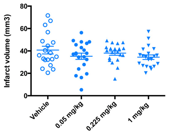 While the trend towards protective effect was observed (Figure 7), the significant therapeutic benefit in terms of the reduction in infarct volume size was not demonstrated (Figure 8). The data from a 3-day mouse MCAO suggested a dose of 0.225 mg/kg to be used in a 7-day rat MCAO efficacy study.