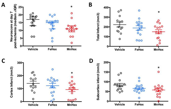 Evaluation of the neurologic outcome in terms of neuroscore and infarct volumes in a 7-day rat MCAO stroke study. Rats were either non treated (vehicle) or treated with FeHex and MnHex at 0.225 mg/kg twice per day for 7 days (n = 15–16). The first dose was given slowly IV via the tail artery at 5 min after reperfusion and the subsequent doses were given SC. At day 7 post-injury, a person blind to the treatment groups assessed the neurological deficit, at which point brains were harvested for infarct volume measurement. Neuroscore (A): p = 0.016 MnHex vs. Vehicle; p = 0.28 FeHex vs. Vehicle. Total infarct volume (B): p = 0.029 MnHex vs. Vehicle; p = 0.31 FeHex vs. Vehicle. Cortex infarct volume (C): p = 0.046 MnHex vs. Vehicle; p = 0.48 FeHex vs. Vehicle. Subcortex infarct volume (D): p = 0.049 MnHex vs. Vehicle; p = 0.11 FeHex vs. Vehicle. The “star” (*) symbol denotes statistically significant difference relative to the vehicle group (p < 0.05).