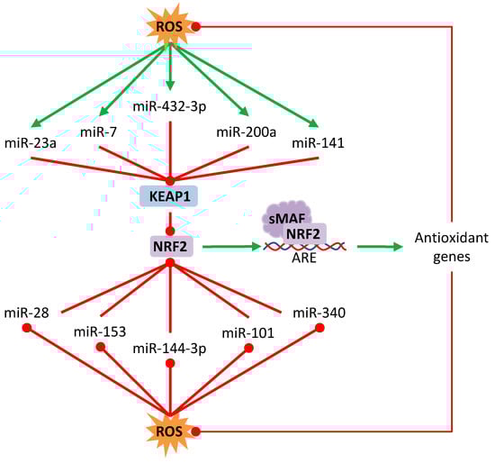 Regulation of NRF2/Keap1 by microRNAs. Oxidative stress can induce or repress some microRNAs that regulate the posttranscriptional expression of Keap1 or NRF2. Red lines with rounded end indicate inhibition. Green arrows indicate activation.