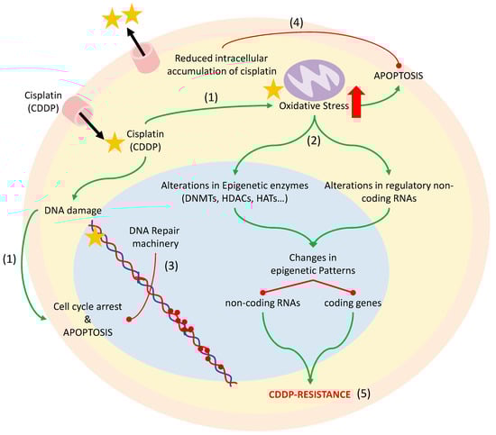 As we mentioned above, cisplatin-resistance development is related to the activation of DNMTs, whose activity can be modified due to the oxidative stress produced by cisplatin treatment. The process of DNA methylation in tumor cells leads to the silencing of specific genes that are crucial in normal conditions for the correct functioning of the cells. This silencing can be direct, if hypermethylation occurs in the promoter region of the gene that becomes inactive, or indirect in those cases where hypermethylation is on regulatory regions of coding and non-coding genes, silencing them and therefore increasing the expression of their target genes.