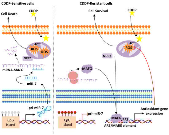 Interestingly, some miRNAs can target the binding partners of NRF2 to affect cisplatin response. An example of this is the miR-7/MAFG/ROS axis that leads to cellular and biological responses that promote tumor development and progression in different tumor types. The main epigenetic mechanism involved in this aberrant alteration is the DNA methylation at the CpG Island surrounding the chromosomal location of miR-7 that has been associated with cancer progression []. In this study, the authors worked with cellular models of cisplatin resistance established after the chronic exposure to the cisplatin treatment of initially cisplatin-sensitive NSCLC and ovarian cancer cell lines [,]. These cisplatin-resistant cell lines share a common downregulation of miR-7 expression, compared to the parental sensitive cells, due to the hypermethylation of a CpG island located on its promoter []. Most importantly, lung adenocarcinoma patients harbor a hypermethylated miR-7 promoter when compared to healthy controls []. In addition, these patients show lower overall and progression-free survival rates, suggesting that the hypermethylation of miR-7 could be involved in the early establishment of the disease []. In fact, miR-7 hypermethylation constitutes a molecular event that accounts mainly at the expense of the emphysema patients, as analyzed from a huge COPD cohort. Patients with emphysema phenotype are considered the group of COPD patients that have a higher risk of developing lung cancer than other COPD phenotypes [], indicating that the silencing of miR-7 through DNA hypermethylation might be one of the main determinants explaining the higher incidence of lung cancer in these patients []. Similarly, studies in ovarian cancer have also shown that the hypermethylation of miR-7 is associated with a worst response to platinum-derived chemotherapy, which is indicated by lower overall survival and progression-free survival rates when miR-7 promoter is methylated []. One of the effects of miR-7 silencing in cisplatin-resistant lung and ovarian cancer cell lines is the upregulation of its target gene MAFG (Musculoaponeurotic Fibrosarcoma Oncogene Family, protein G) [,] (Figure 3).