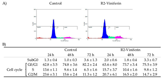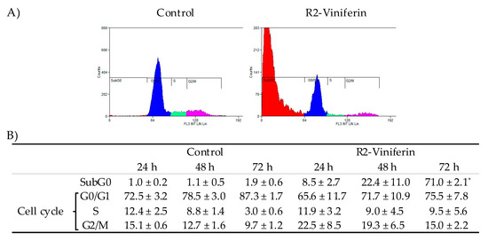 Cell cycle distribution of HepG2 treated with R2-viniferin. (A) Representative graphs of cell cycle analysis by flow cytometry at 72 h. (B) Statistical analysis of cell cycle distribution. Data are expressed as the percentage (%) of cells at different stages of cell cycle. In the case of cells in subG0, data are expressed as the percentage of total cells. Results are the mean ± SE of three experiments. * p < 0.001, significantly different from control.