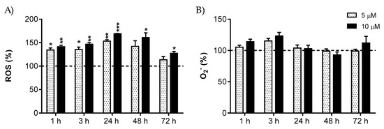 R2-viniferin increased the intracellular ROS concentration dose-dependently from the first time assayed (Figure 5A). At the highest concentration used (10 µM), ROS remained significantly elevated up to 72 h. In the case of mitochondrial O2−, no significant effect could be observed at any of the stilbene doses or times assayed (Figure 5B).
