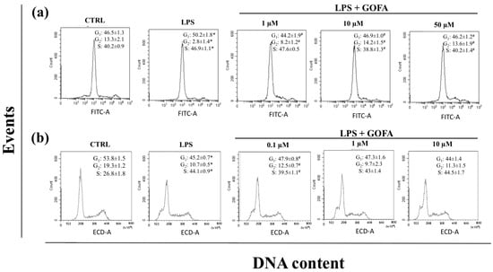 Flow cytometry analysis for cell cycle DNA content in G0/G1, S, G2/M phase after treatment of LPS with and w/o GOFA in U937 and HCT116 cells. (a) U937 cells were treated with GOFA and the combination of LPS+GOFA and after 24 h cells were stained with propidium iodide for cell cycle analysis and detected by flow cytometry. Percentage of cells was calculated by using MultiCycle software; (b) HCT116 cells were treated with GOFA and the combination of LPS+GOFA and after 24 h treatment, cells were processed as described earlier and cell cycle analysis were performed by Flow cytometry. The figures shown are representative analysis from at least three experiments. * p < 0.05 vs. control cells; # p < 0.05 vs. cells treated with LPS alone.