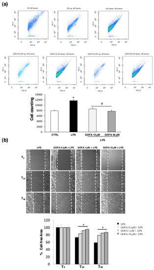 The effect of GOFA on LPS-induced migration/infiltration of U937 cells was investigated in vitro by using a Boyden chamber Transwell assay. Figure 4a shows representative flow cytometric cell counting results for the samples in the SSC-A vs. FSC-A graphs. The U937 cell count is significantly increased by 32% after the LPS stimulation compared to untreated cells (Figure 4a, * p < 0.05). A significant reduction in the cell number is observed in cells pre-treated with GOFA. Specifically, 10 and 50 µM of GOFA have decreased the number of U937 cells by 27% and 34%, respectively (Figure 4a; # p < 0.05) following incubation for 24 h. To measure the HCT116 cell migration ability, we employed a scratch assay (Figure 4b). HCT116 cells were pre-treated for 1 h with GOFA (0.1, 1 and 10 µM) and then stimulated with LPS for 24 and 48 h. A lawn of cells was scratched with a fine tip, and scratch closure size was measured for areas between two layers of scratches. HCT116 cells’ scratch assay revealed that LPS-stimulated cell migration and cell invasion were significantly inhibited by GOFA. Migration cell assays indicated that GOFA have an inhibitory effect on the invasiveness of LPS-treated HCT-116 cells, significantly reducing the matrix invasive potential.
