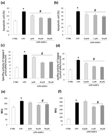 In line with apoptosis data, caspase 3 activity, known to be crucial mediators of programmed cell death, showed a marked increase in LPS-stimulation in both cell lines as compared to control (Figure 5c,d). Pre-treatment with all GOFA concentrations used significantly reduced the percentage of apoptotic cells.
